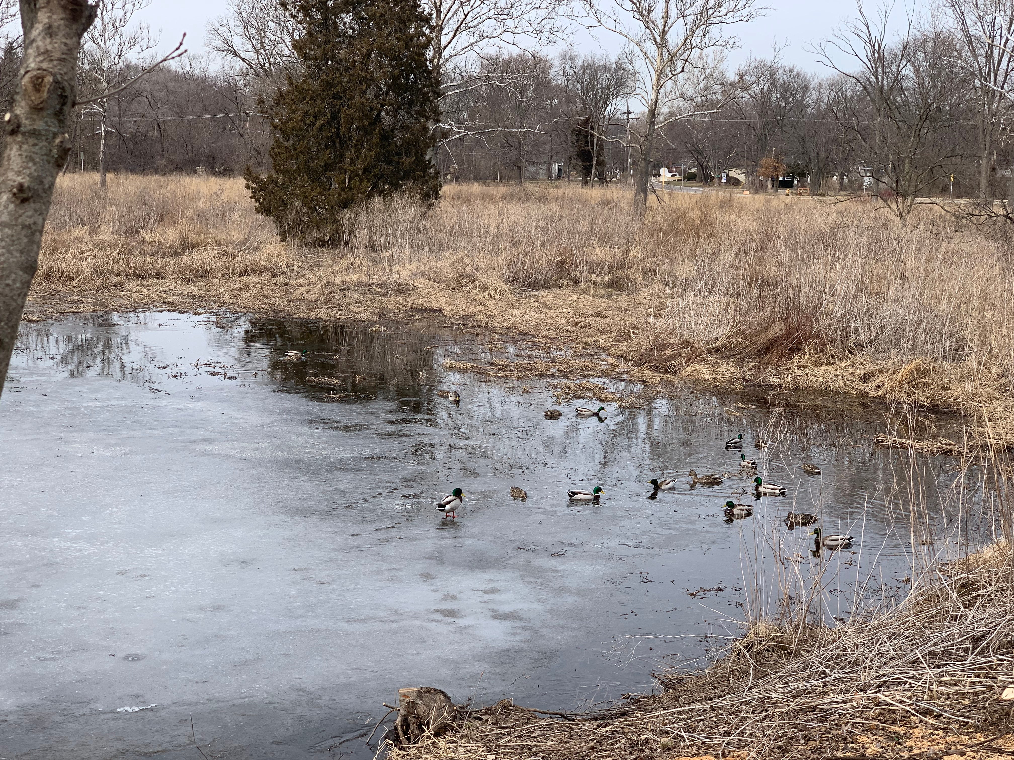 Heard a robin singing its spring song for the first time this year. A flock of 14 wild Ducks were swimming on the river this AM - probably Golden Eyes, Black Heads, and Black and White Breasts. — E. L. Kammerer, March 29, 1940