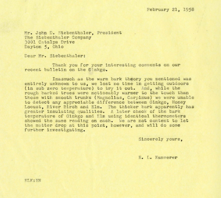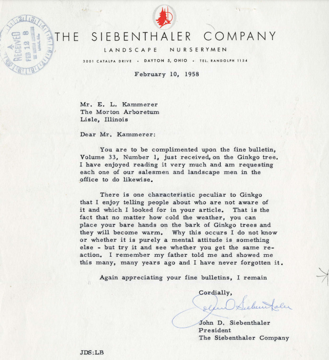 I came across an anecdote in a letter written by John D. Siebenthaler to my grandfather in 1958, complimenting him on the recent Bulletin of Popular Information about Gingko trees. Mr. Siebenthaler included a trick passed down to him by his father: that even in the coldest weather, placing your hands on a Gingko’s bark will warm them.
