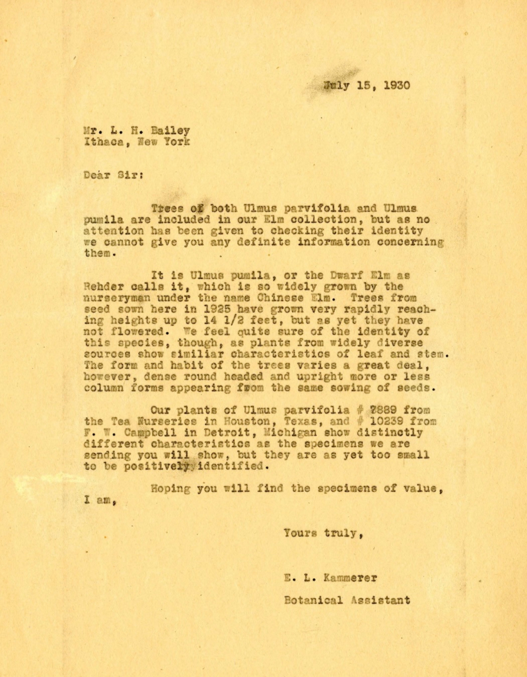 One such letter concerns the Chinese Elm, which L. H. Bailey of New York noticed presented differently in trade publications than its description in scientific literature. He noted that Ulmus pumila and Ulmus parvifolia are both referred to as Chinese Elm in various trade materials, but he wondered if one or the other truly matched what nurserymen were growing and labeling as such.